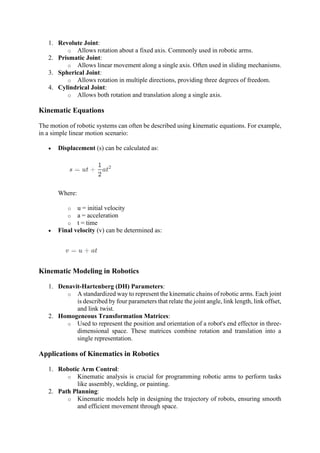 The document offers a comprehensive overview of kinematics in robotics, covering concepts like forward and inverse kinematics, as well as the role of rotation and transformation matrices. It highlights their applications in controlling robotic arms, path planning, and collision detection, emphasizing the importance of mathematically modeling motion. The principles of manipulator kinematics are also detailed, focusing on how joint configurations affect the end effector's movement in 3D space.