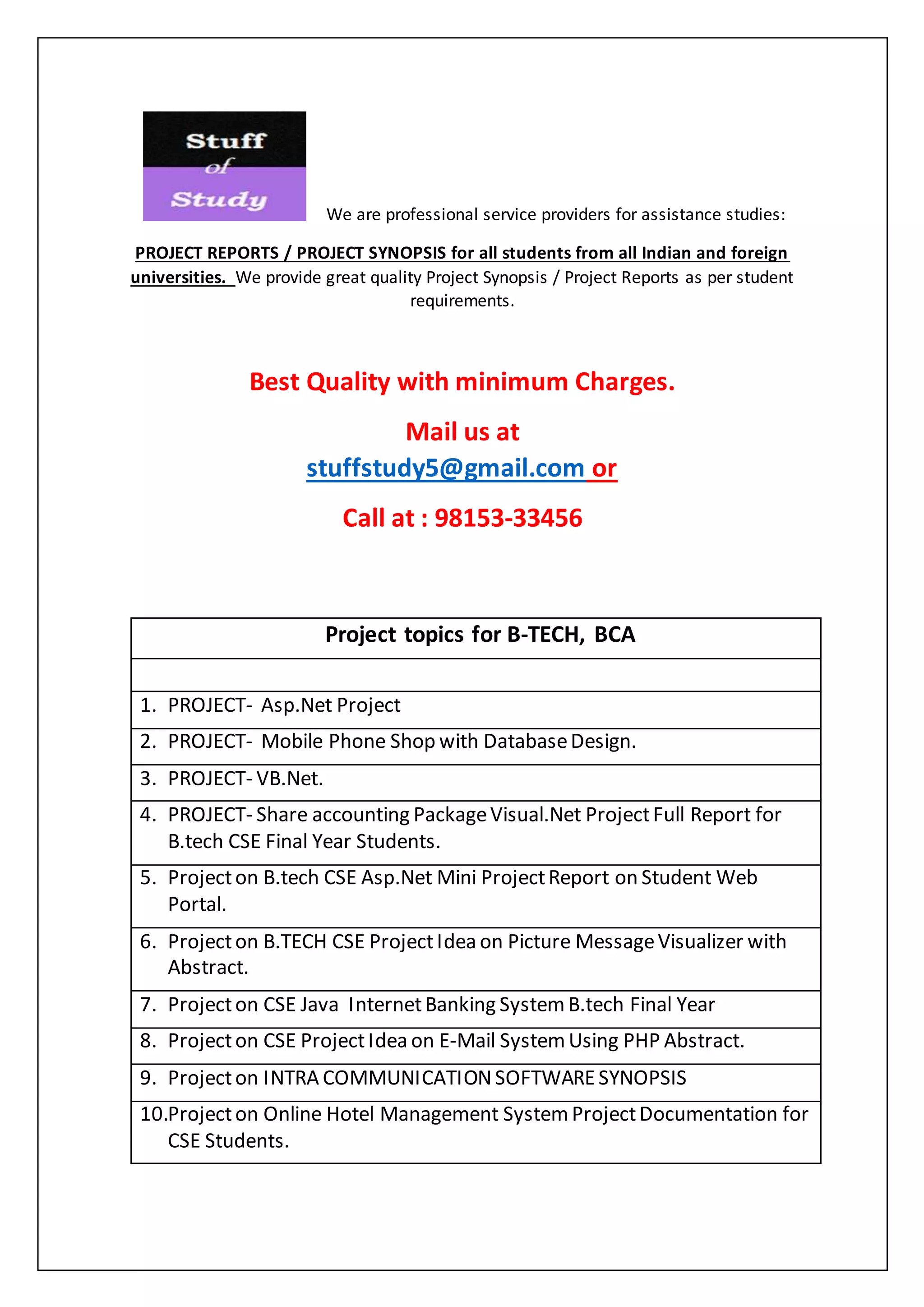 The document offers professional project report and synopsis services for students from various Indian and foreign universities, focusing on quality and affordability. It includes a broad range of project topics for B.Tech and MCA students, covering areas like ASP.NET, Java, and web development. Contact details for inquiries are provided, emphasizing the service's commitment to delivering quality projects at low prices.