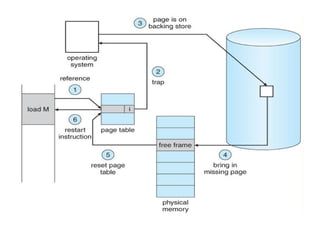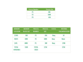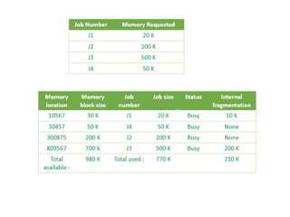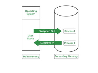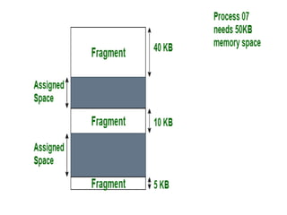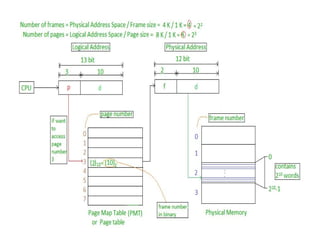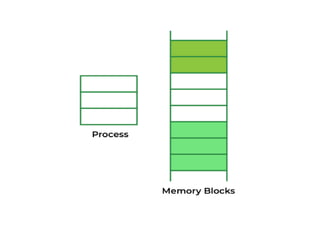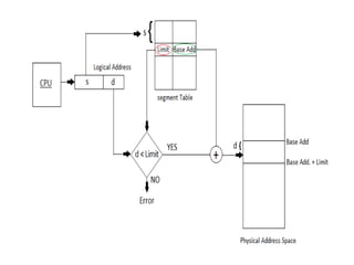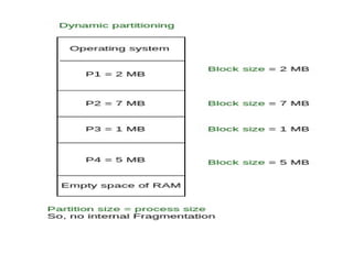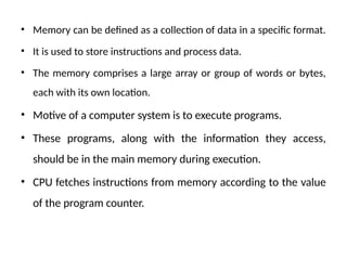 The document covers memory management concepts such as main memory, logical and physical address spaces, and the importance of memory allocation techniques. It discusses dynamic and static loading, fragmentation issues, and strategies like paging and virtual memory to optimize memory usage. Additionally, it examines memory allocation methods including first fit, best fit, and worst fit, and explores the effects of locality of reference on cache operations.