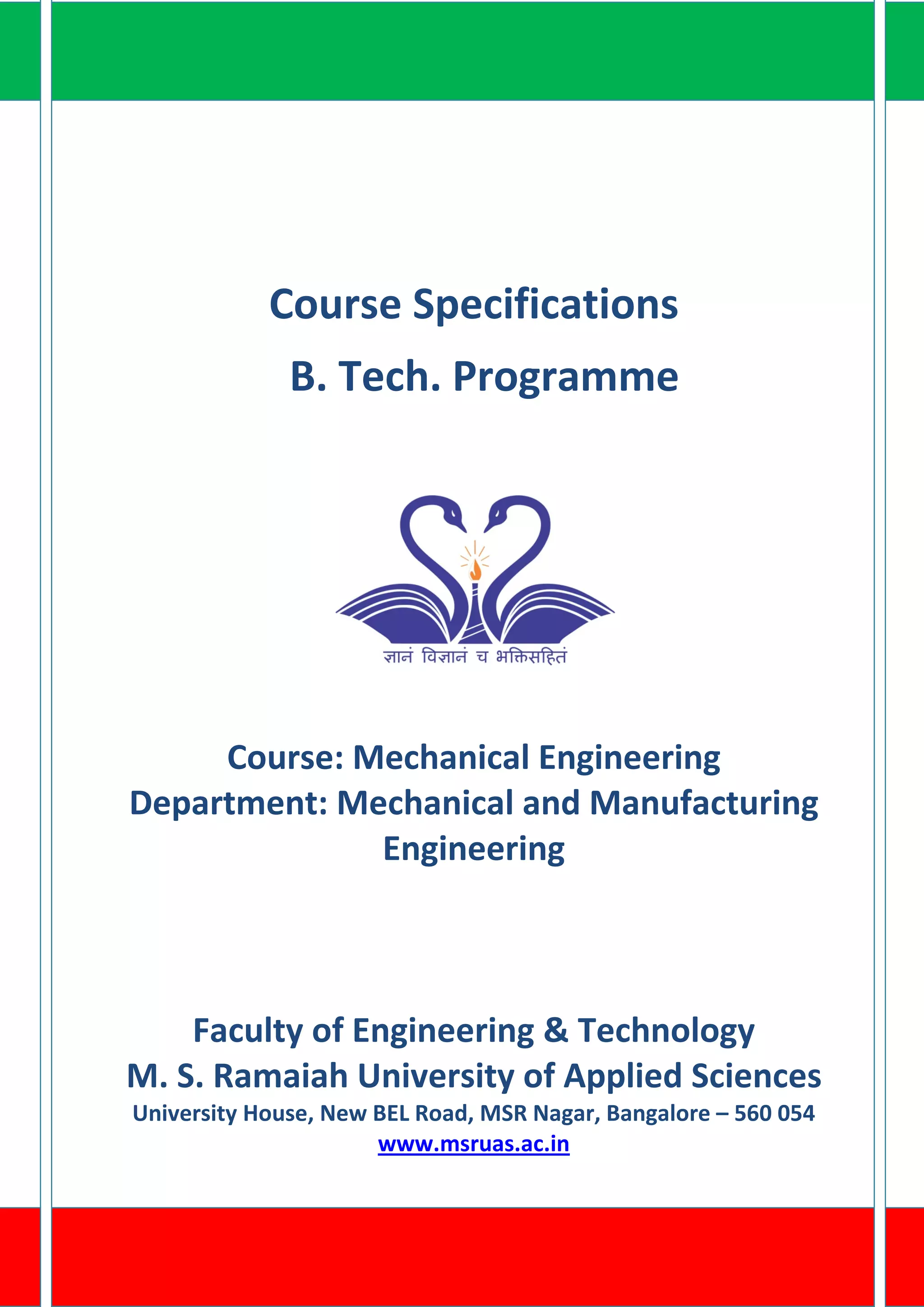 This document provides course specifications for the Bachelor of Technology in Mechanical Engineering program offered by the Mechanical and Manufacturing Engineering Department at M.S. Ramaiah University of Applied Sciences. It outlines the details of the program including the program structure, intended learning outcomes, and course objectives. The program aims to produce graduates with skills in mechanical system design, analysis, testing and problem solving to prepare them for careers in mechanical engineering.