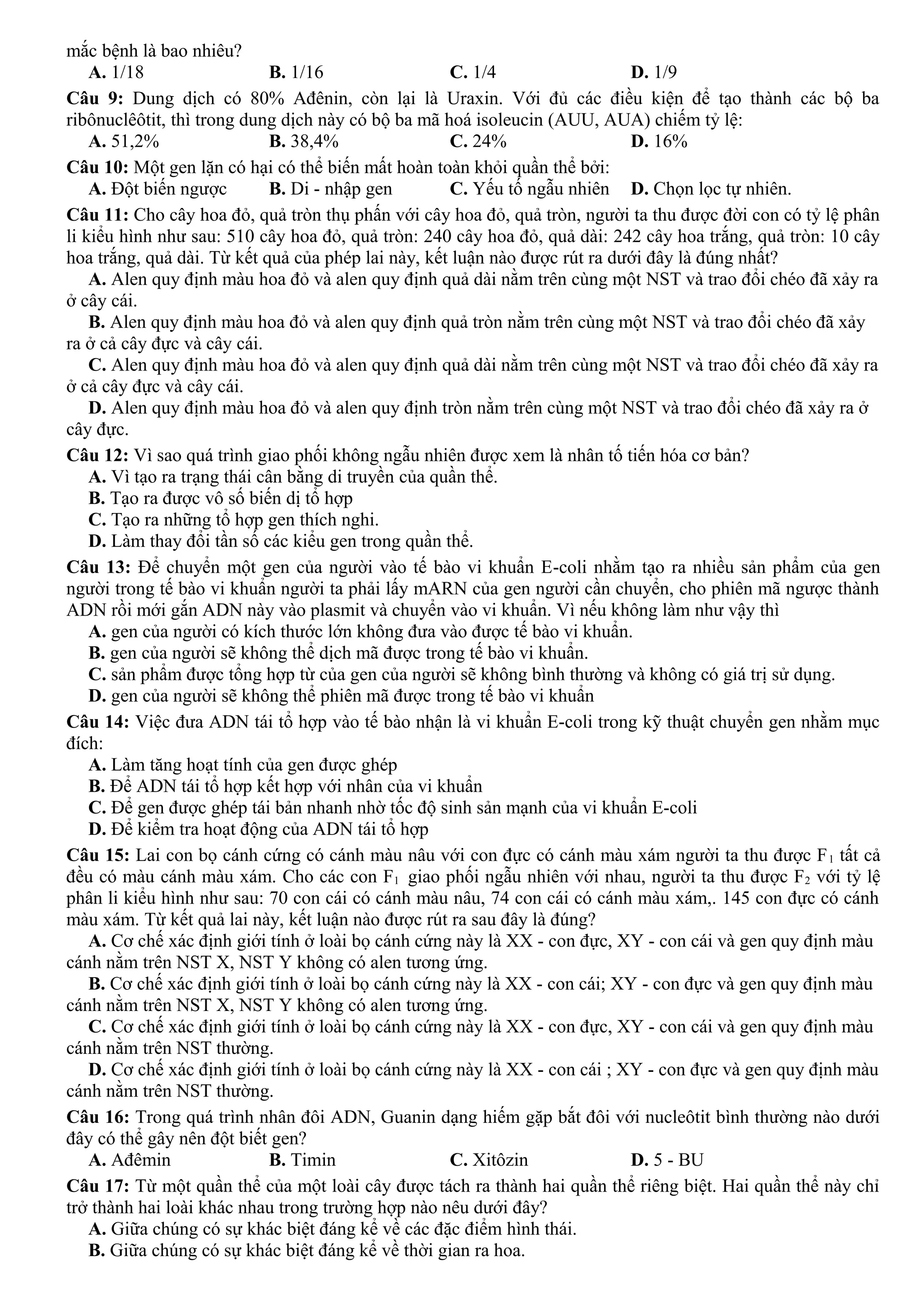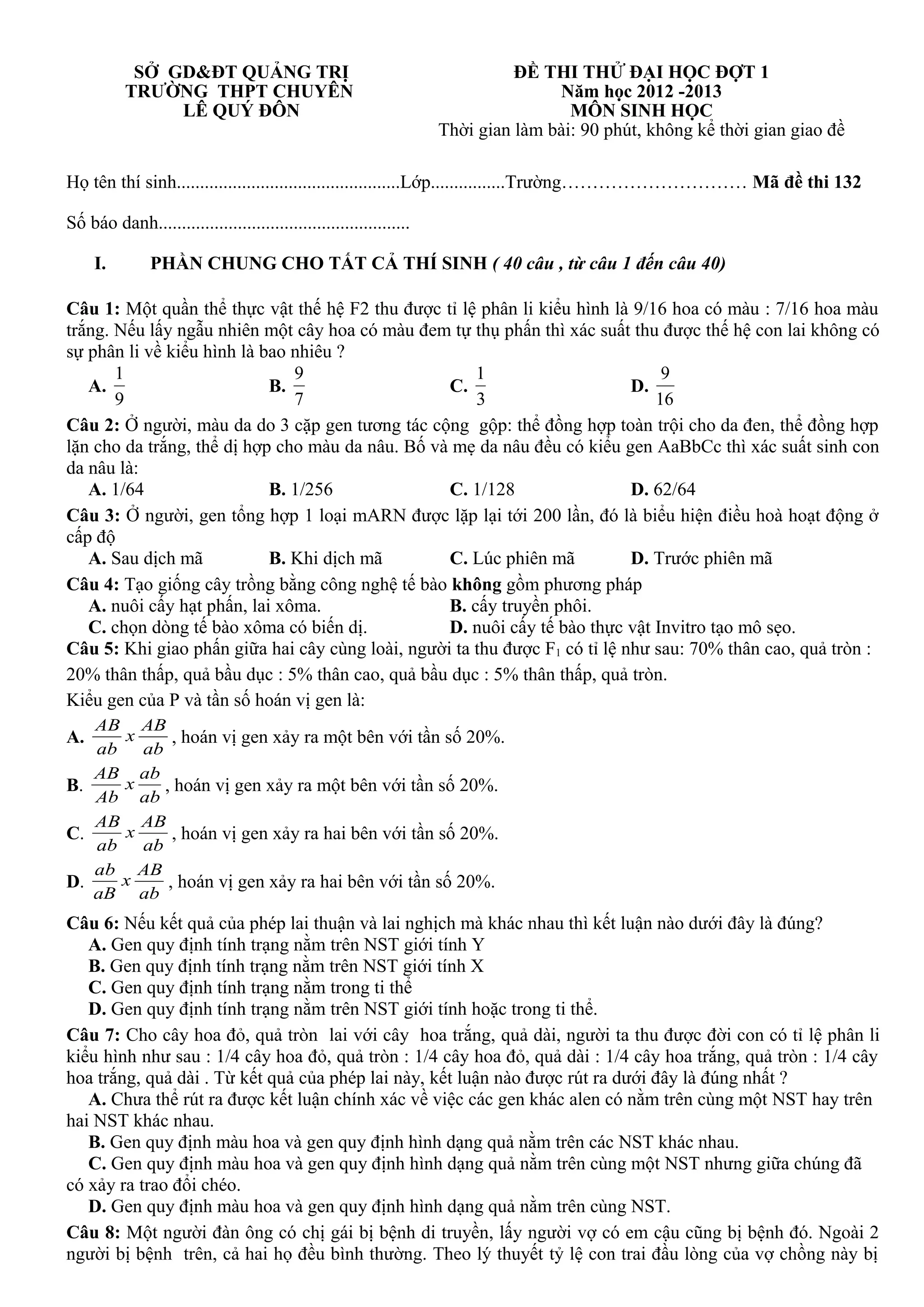Đề thi thử đại học môn sinh học năm học 2012 - 2013 có 40 câu hỏi, tập trung vào di truyền học, xác suất di truyền, và ứng dụng công nghệ sinh học. Các câu hỏi trình bày các tình huống thực tế và yêu cầu thí sinh phân tích gen, kiểu hình, và tần số hoán vị gen. Đề thi có nội dung phong phú, đánh giá kiến thức tổng quát về sinh học di truyền.