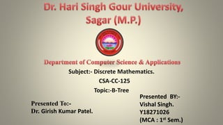 The document discusses B-Trees, which are self-balancing search trees used to store large blocks of data efficiently, such as in database and file systems. It describes the insertion and deletion algorithms for B-Trees, providing an example of inserting values into an initially empty B-Tree. B-Trees allow for efficient searching, insertion, deletion and modification of huge collections of records.