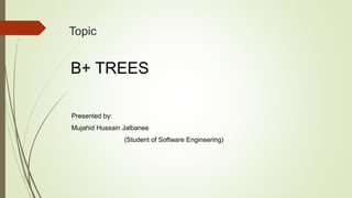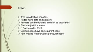 B+ trees are a data structure used to store sorted data like files in a disk. Each node contains key values and pointers to other nodes. Leaf nodes contain file data while internal nodes contain keys to guide searching. Insertion may cause nodes to split, requiring redistribution of keys and merging of nodes. Deletion is handled through redistribution or merging of neighboring nodes to maintain a minimum number of keys per node. B+ trees provide efficient storage and retrieval of sorted data through balanced tree structure and localized rebalancing during updates.