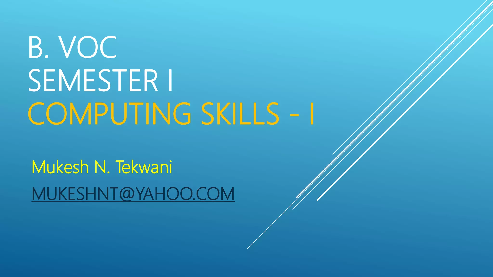 This document provides a syllabus and lecture materials for an introductory computing skills course. The syllabus covers introduction to computers, operating systems, internet usage, Microsoft Word, and Microsoft Excel. The lecture materials define the need for computers, describe their evolution through different generations using vacuum tubes, transistors, integrated circuits, and microprocessors. It also covers different types of computers like analog, digital and hybrid computers, as well as computers categorized by size as supercomputers, mainframes, mini computers, and personal computers. The document explains how a computer functions by accepting input, storing and processing data, and providing output.