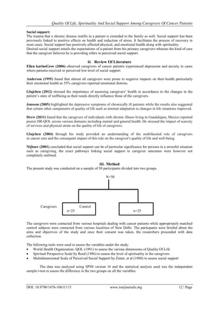The document summarizes a study that investigated the quality of life, spirituality, and social support among 25 caregivers of cancer patients compared to a control group of 25 individuals. Key findings included: