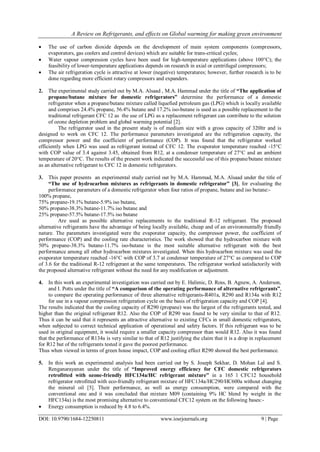 This document reviews 10 research papers on alternative refrigerants to replace chlorofluorocarbons and hydrochlorofluorocarbons. The key points summarized are: