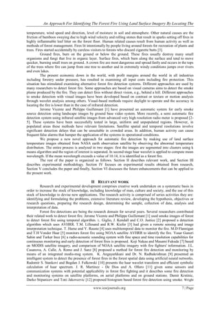 This document presents a new approach for identifying forest fires using land surface temperature satellite imagery. It involves segmenting the imagery into clusters using k-means clustering to locate regions of abnormal temperature distribution. The mean wavelength value is then computed for regions of interest using Haar wavelets. Experimental results on 312 images found that a mean wavelength exceeding 10.14 accurately identified forest fire locations according to historical records, with an average accuracy of 89.5%. This approach provides an improved method for early forest fire detection compared to existing techniques.