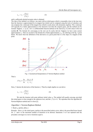 This document summarizes a study on evaluating the rate of convergence of the Newton-Raphson method. A computer program was coded in Java to calculate cube roots from 1 to 25 using Newton-Raphson. The lowest rate of convergence was for the cube root of 16, and the highest was for 3. The average rate of convergence was found to be 0.217920. Formulas for estimating the rate of convergence from successive approximations are also presented.