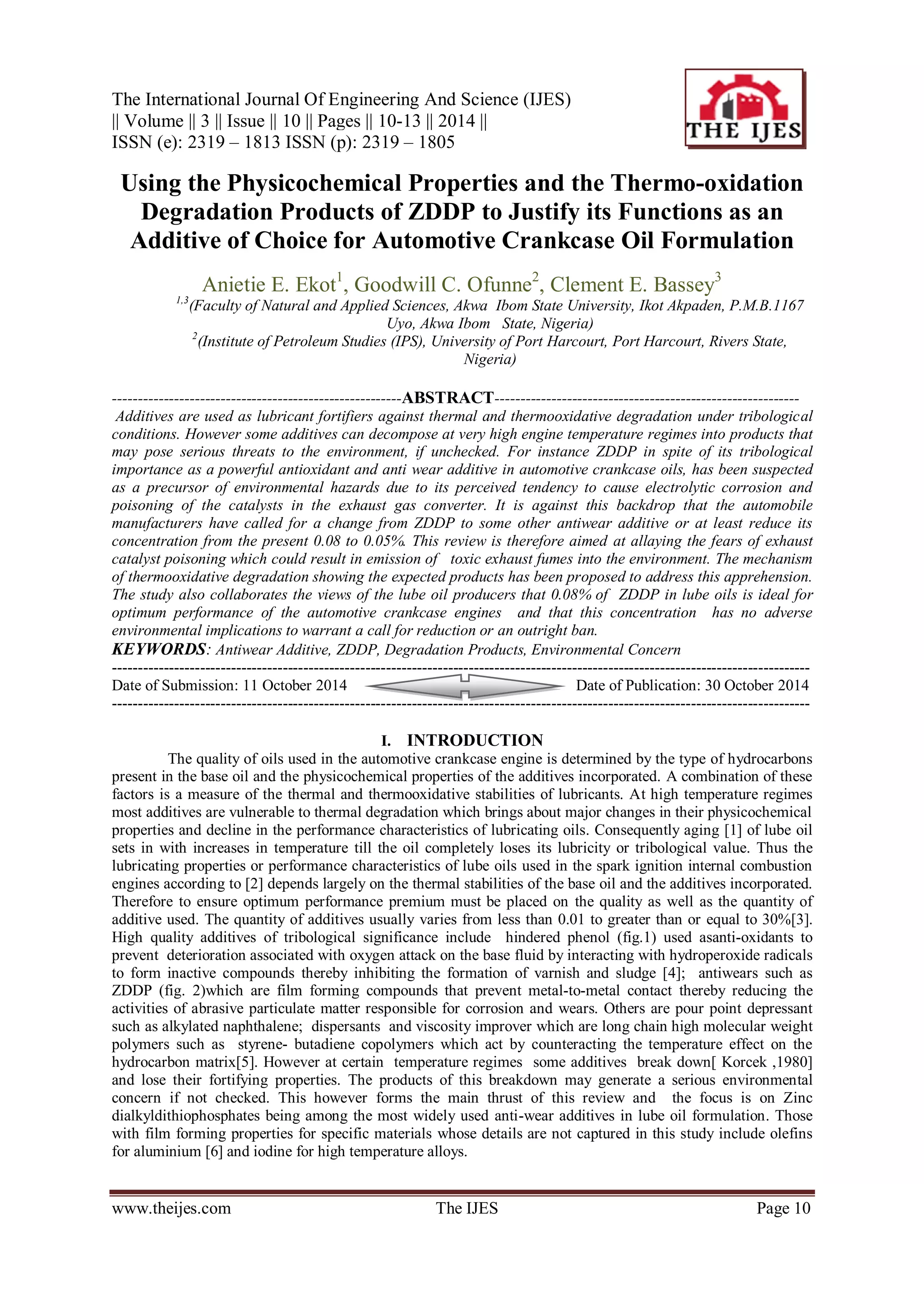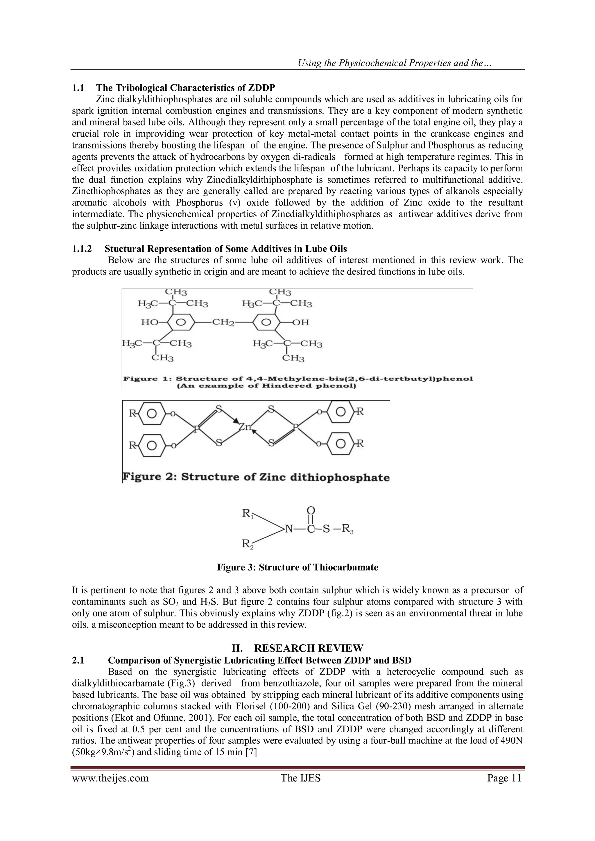 The document reviews the physicochemical properties and thermo-oxidation degradation products of zinc dialkyldithiophosphate (ZDDP) as a key additive in automotive crankcase oils, highlighting its effectiveness against thermal degradation while addressing environmental concerns regarding its decomposition products. It argues that ZDDP maintains optimal performance at concentrations of 0.08%, dismissing fears of exhaust catalyst poisoning and presenting evidence of its superior anti-wear capabilities compared to alternative additives. The study concludes that ZDDP remains the additive of choice for automotive lubricants despite concerns about its environmental impact.