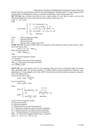 This document evaluates and compares the performance of seven high-speed congestion control protocols: Bic TCP, Cubic TCP, Hamilton TCP, HighSpeed TCP, Illinois TCP, Scalable TCP and YeAH TCP. The protocols are simulated using NS-2 with multiple flows and their efficiency, fairness, and overall performance are calculated and compared for different numbers of flows. Key metrics like throughput, link utilization, and fairness index are analyzed for the protocols under varying parameters like RTT, queue size, and number of flows. Cubic TCP and Bic TCP generally showed better performance than the other protocols based on the simulations.