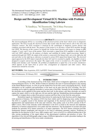 The document discusses the design and development of a virtual ECG machine using LabVIEW, aimed at diagnosing heart diseases by analyzing the electrical activity of the heart. It describes the methodology involving signal acquisition from electrodes, amplification, and processing through LabVIEW software for detecting abnormalities in ECG waveforms. The project emphasizes the significance of accurate ECG feature extraction for effective diagnosis and the challenges posed by noise interference in the signal.