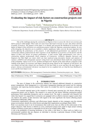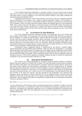 The document evaluates the impact of risk factors on construction project costs in Nigeria, identifying key issues such as cost overruns and time delays. A study using a questionnaire distributed to industry professionals revealed that cost and time-related risks are the most significant, with varying levels of impact based on the factors identified. It emphasizes the need for better risk management practices in the construction industry to improve project outcomes.