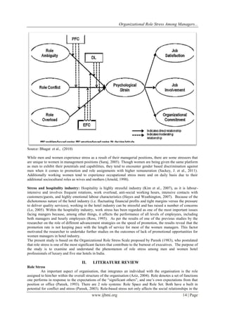 The study investigates organizational role stress among women managers in the Indian hospitality industry, using a sample of 45 female and 32 male managers. Findings indicate that women experience moderate to high levels of stress, particularly due to inter-role distance, role erosion, role stagnation, and role overload, with statistically significant differences compared to their male counterparts. The research emphasizes the unique stressors women face in management roles and suggests implications for HR professionals to address these challenges.