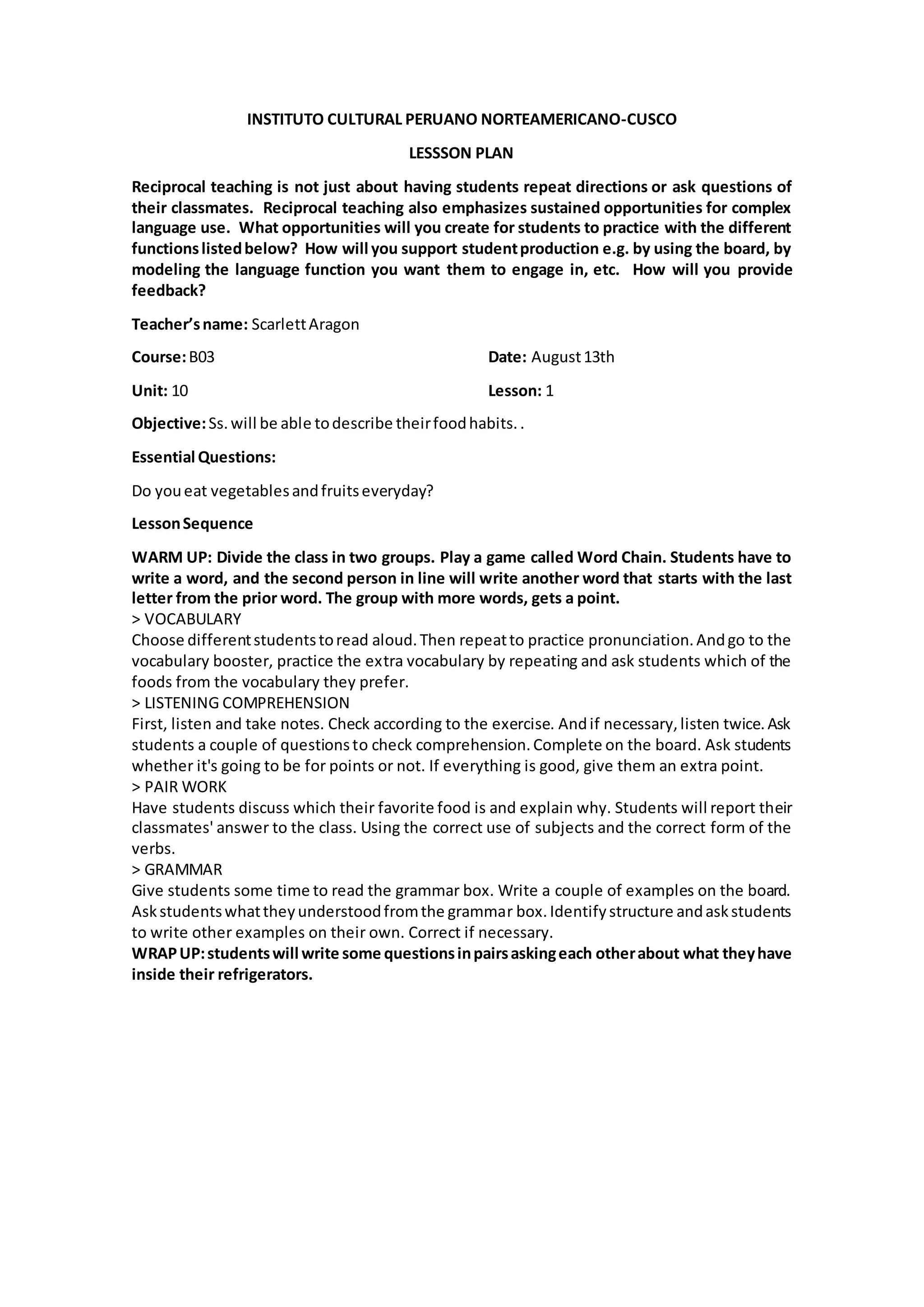 This lesson plan outlines activities for three English classes focusing on food vocabulary, grammar structures like count/non-count nouns, and conversational skills like offering and asking for foods. Each lesson includes a warm-up activity, vocabulary practice, listening exercises, grammar instruction and practice, pair work, and a wrap-up. Feedback is provided through board work and points. The goal is for students to gain proficiency in describing food habits and having conversations about food preferences.
