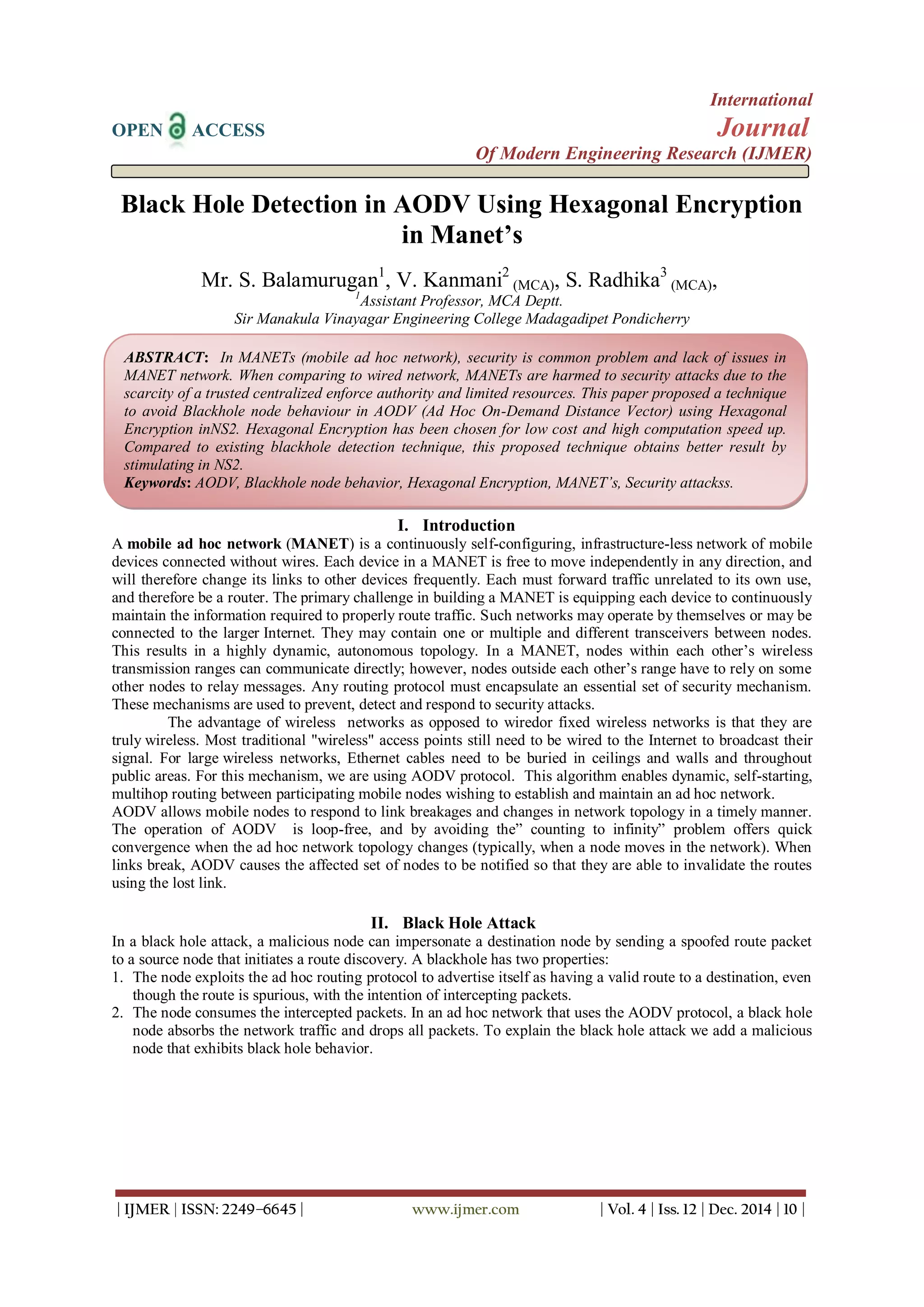 The document discusses a proposed technique for detecting and preventing black hole attacks in mobile ad hoc networks (MANETs) using the AODV protocol and hexagonal encryption. It highlights the vulnerabilities of MANETs to security attacks due to their decentralized nature and presents a method that improves on existing detection techniques by leveraging encryption for better performance. The results from simulations indicate that the proposed method enhances packet delivery ratios while reducing delays compared to traditional approaches.
