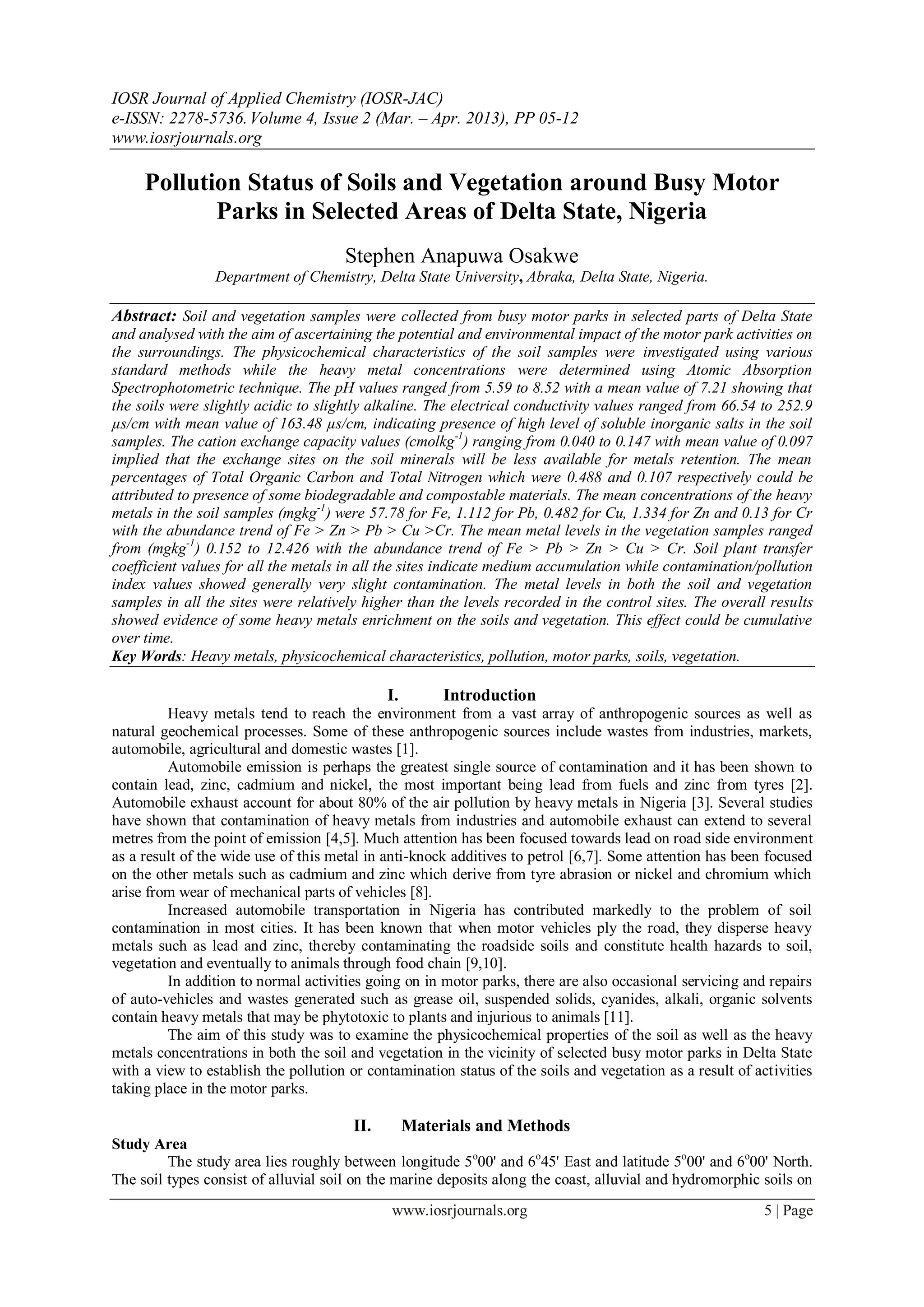 The document analyzes soil and vegetation samples collected from busy motor parks in Delta State, Nigeria to investigate the potential environmental impact. Physicochemical analysis found soil pH ranged from slightly acidic to alkaline. Electrical conductivity values indicated high levels of soluble salts. Total organic carbon and nitrogen could be attributed to biodegradable materials. Heavy metal analysis found mean concentrations of iron, lead, copper, zinc and chromium in soil samples, with iron having the highest abundance. Heavy metal levels in vegetation samples ranged lower than in soils. Soil-plant transfer coefficients indicated medium metal accumulation, while contamination indices showed very slight contamination. Overall, heavy metal levels were relatively higher than control sites, showing evidence of enrichment that could accumulate over time.