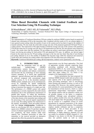 The document discusses the implementation of Tomlinson-Harashima (TH) pre-coding in multiuser MIMO systems utilizing quantized channel state information (CSI) at the transmitter. It compares the performance of TH pre-coding against linear zero-forcing pre-coding, highlighting how TH pre-coding achieves superior results in terms of sum rate, particularly under limited feedback conditions. Numerical results illustrate that TH pre-coding not only performs better with perfect CSI but also retains efficiency when facing quantized CSI challenges.