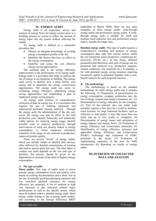 This paper discusses energy consumption characteristics in the industrial sector of India, highlighting the importance of energy audits as a tool for enhancing energy efficiency. It presents methodologies, findings from energy audits conducted in selected industries, and potential improvements through better management and equipment upgrades. Key issues include outdated technology, low energy efficiency, and the need for effective energy management strategies to meet growing energy demands.