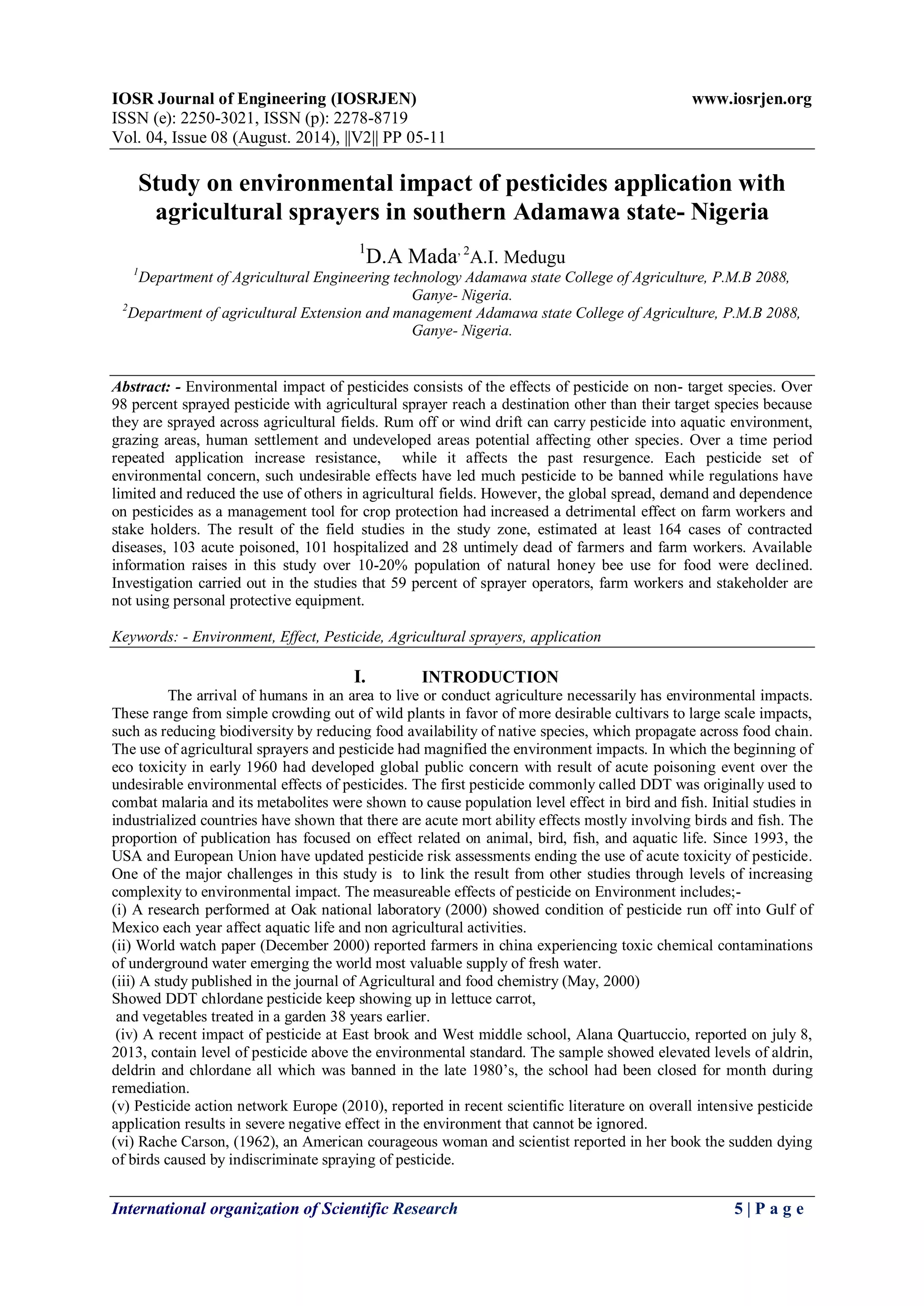 This document summarizes a study on the environmental impacts of pesticide application with agricultural sprayers in southern Adamawa state, Nigeria. The study found that pesticide use has increased significantly in the region over time, with 84% of farmers purchasing pesticides from open markets with less oversight. Prolonged exposure to pesticides led to 164 cases of illness, 103 poisonings, 101 hospitalizations, and 28 deaths among farmers and workers. The study also found negative environmental impacts, including a decline in fresh water quality (83%), fish and aquatic life (80%), bee populations providing food (15-20%), and some bird species (78%). Only 38% of sprayer operators were properly trained, putting them at risk from exposure