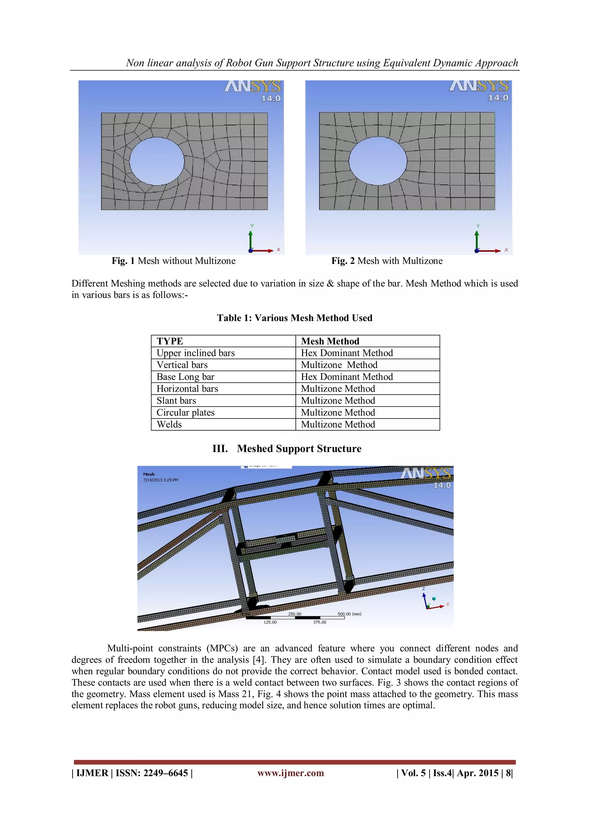 The document presents a finite element analysis (FEA) of a robot gun support structure for spot welding robots, focusing on cost optimization through the use of multiple guns on a single robot. It utilizes a multizone meshing technique and models dynamic loads as equivalent g-force loads to ensure accuracy in stress optimization, reducing maximum stress from 282 MPa to 80 MPa. Emphasis is placed on establishing a standard procedure for analyzing such structures while highlighting the significance of geometric nonlinearity and advanced features in FEA.