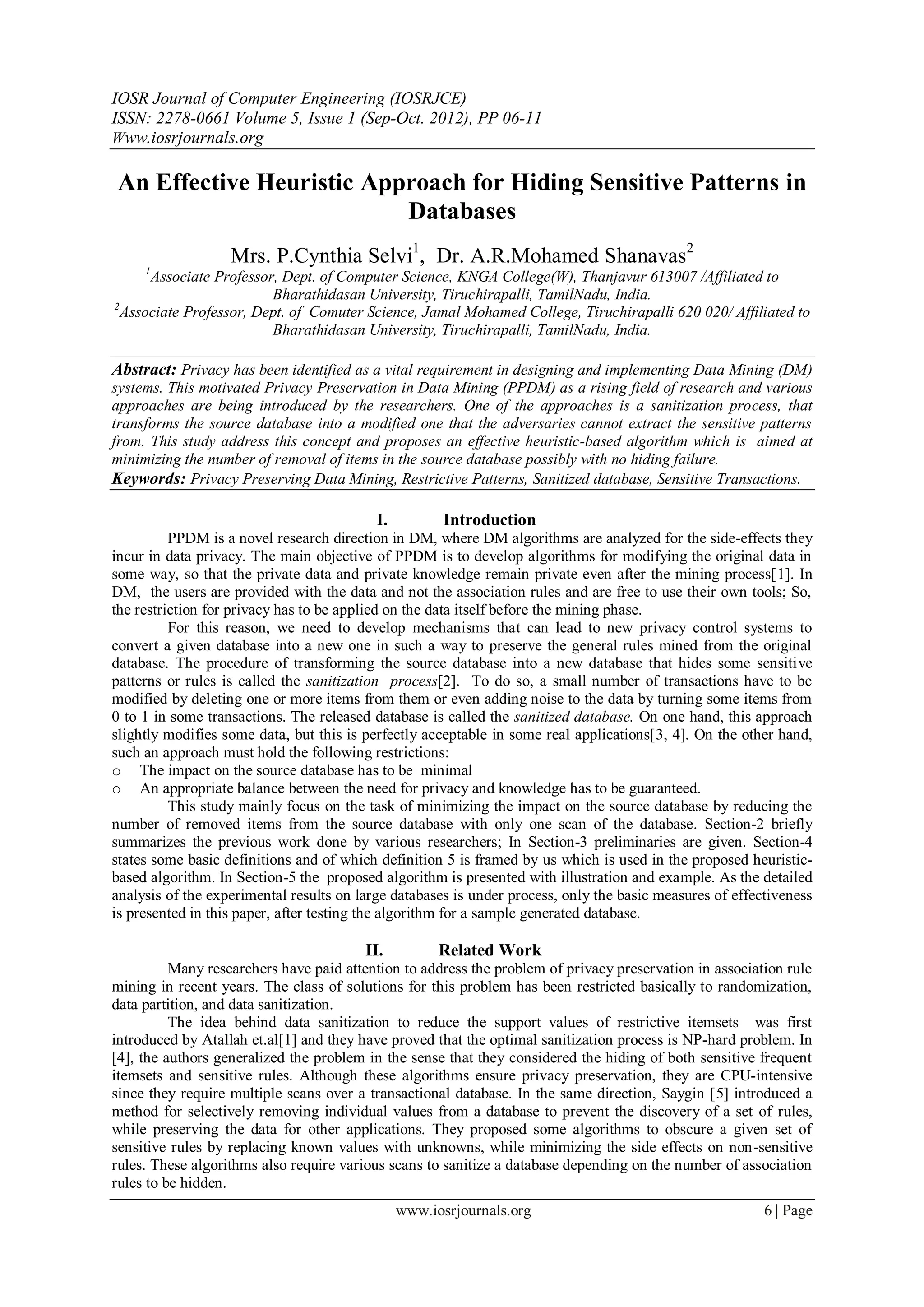 The document presents an algorithm for sanitizing a database to hide sensitive patterns while minimizing changes to the original data. It identifies sensitive transactions containing restrictive patterns to be hidden and sorts them by degree and size. It then selects items with the maximum cover across restrictive patterns and removes them from sensitive transactions, reducing support for the patterns. This process iterates until restrictive pattern support is reduced to 0. The sanitized database combines modified sensitive transactions with unmodified non-sensitive transactions. The algorithm is tested on sample databases to evaluate effectiveness with minimal impact on the original data.