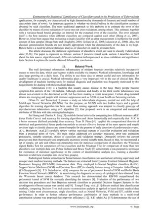 This document summarizes a research paper that analyzes the statistical significance of different classifiers for predicting tuberculosis. The paper first compares the accuracy of classifiers like decision trees, support vector machines, k-nearest neighbor, and naive Bayes on tuberculosis data. It then evaluates the performance of these classifiers using a paired t-test to select the optimal model. The results showed that support vector machines and decision trees were not statistically significant, while support vector machines combined with naive Bayes and k-nearest neighbor were statistically significant.