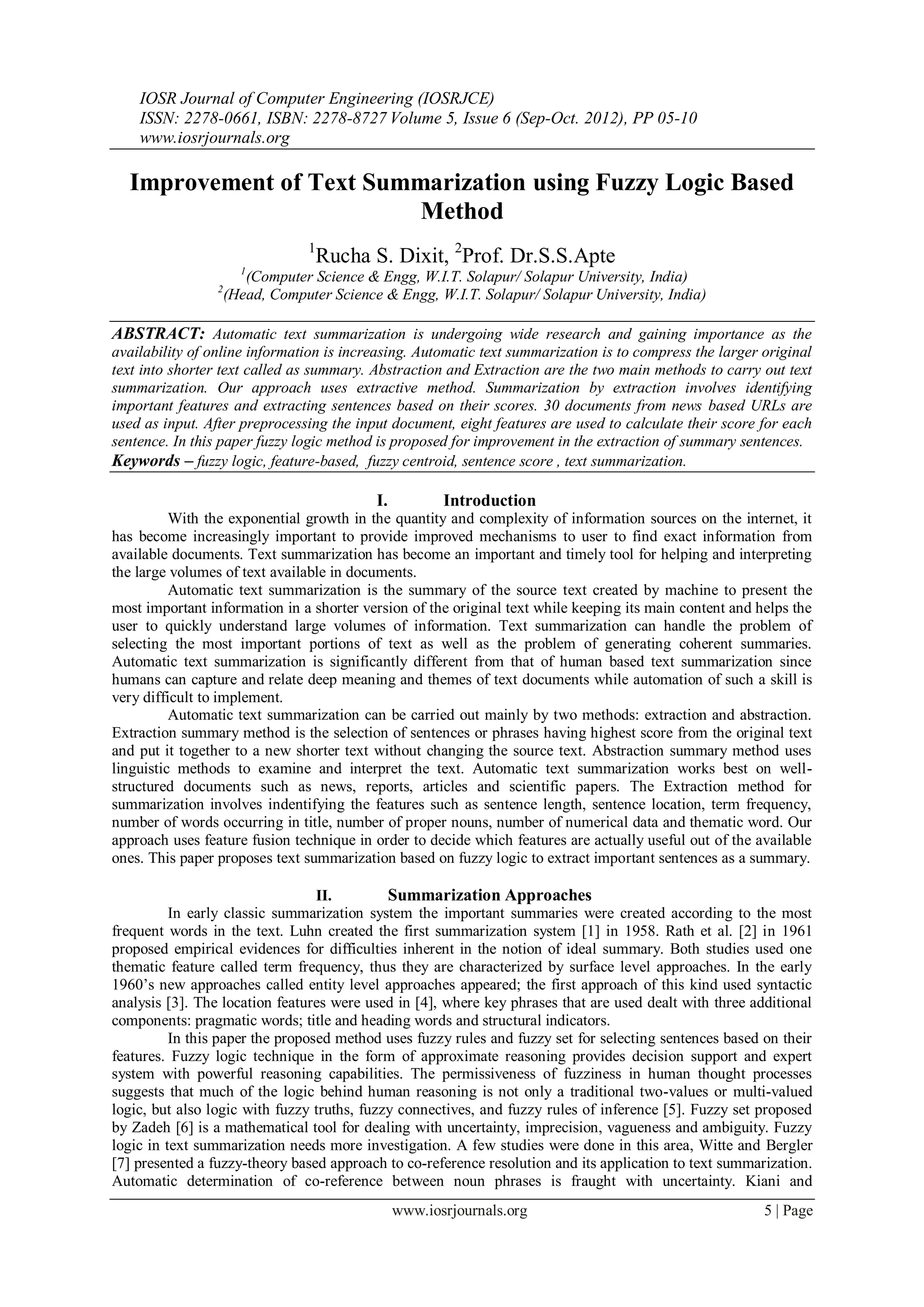 The document describes a method for improving text summarization using fuzzy logic. It proposes using fuzzy logic to determine the importance of sentences based on calculated feature scores. Eight features are used to score sentences, including title words, length, term frequency, position, and similarity. Sentences are then ranked based on their fuzzy logic-determined scores. The highest scoring sentences are extracted to create a summary. An evaluation of summaries generated using this fuzzy logic method found it performed better than other summarizers in accurately reflecting the content and order of human-generated reference summaries. The method could be expanded to multi-document summarization and automatic selection of fuzzy rules based on input type.