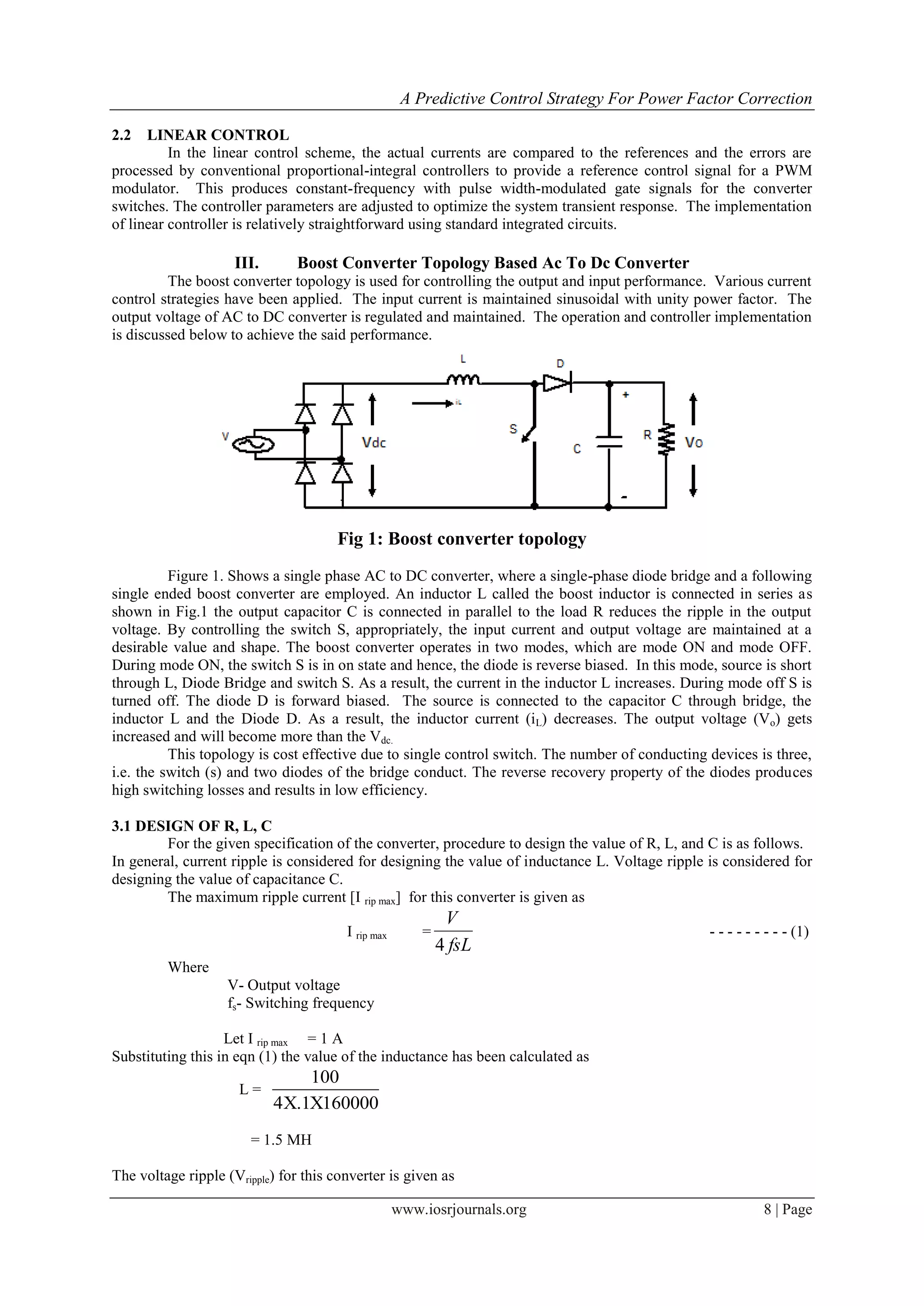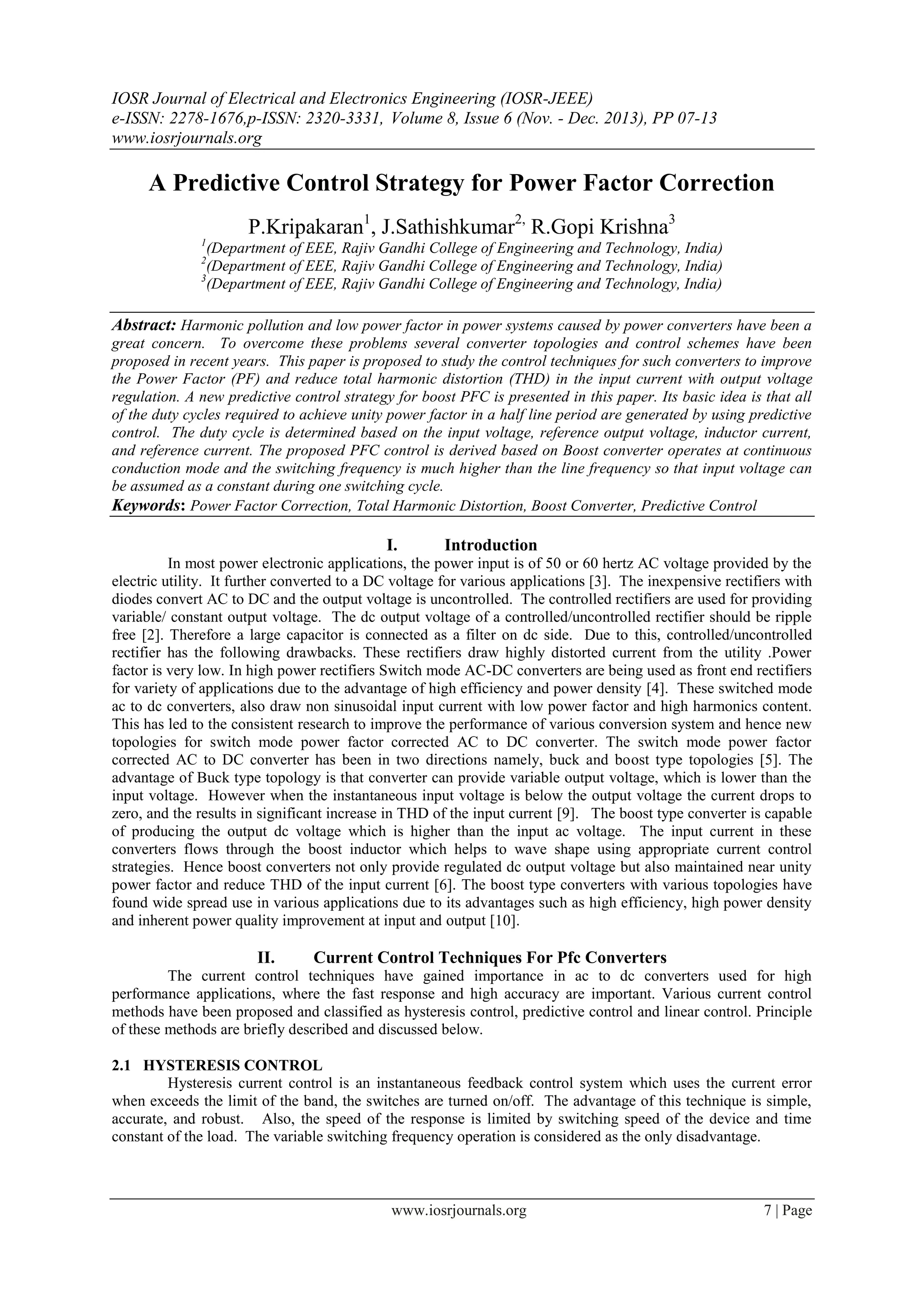 This document presents a predictive control strategy for a boost power factor correction (PFC) converter. It begins with an introduction to power factor correction and discusses common control techniques like hysteresis control and linear control. It then describes the boost converter topology used for the PFC converter and discusses the design of key components. The predictive control strategy is presented, which predicts the duty cycle needed over a half line period to achieve unity power factor. Simulation results show the control strategy maintains near unity power factor and low total harmonic distortion under different operating conditions.