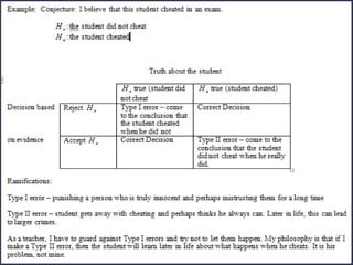Statistical hypothesis testing involves formal procedures to accept or reject statistical hypotheses about population parameters based on sample data. It involves stating the null and alternative hypotheses, analyzing sample data using test statistics, and interpreting results to either reject the null hypothesis if the test statistic is unlikely or fail to reject it if it is not significant based on the p-value and significance level. Type I and II errors can occur, with the significance level setting the probability of a Type I error and the power test measuring the probability of avoiding a Type II error. Hypothesis tests can use one-tailed or two-tailed regions of rejection depending on the alternative hypothesis.