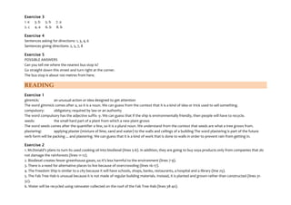 This document provides vocabulary and grammar exercises related to environmental topics. It begins with vocabulary related to pollution sources and definitions. Grammar exercises practice future tenses including future simple and "be going to." The reading section discusses ways companies and concepts address environmental issues, such as McDonald's plans for biodiesel and a floating city concept.