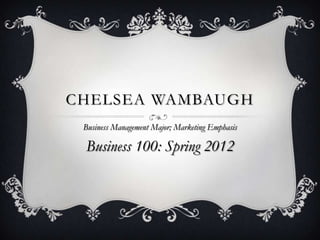 Chelsea Wambaugh is a business management major with a marketing emphasis who took Business 100 in spring 2012. She learned about the hospitality industry, Marriott International and Wyndham Worldwide Corp., resume writing, and her goals, strengths, and weaknesses. Her goals are to earn a master's degree in business management, work in Marriott's marketing department, own personal businesses, and mentor others. She plans to achieve her goals by earning bachelor's and master's degrees, applying for an internship at Marriott, constantly improving herself, and using resources. She completed extra work like workshops and mock interviews and is an active member of the Collegiate Entrepreneur's Organization.