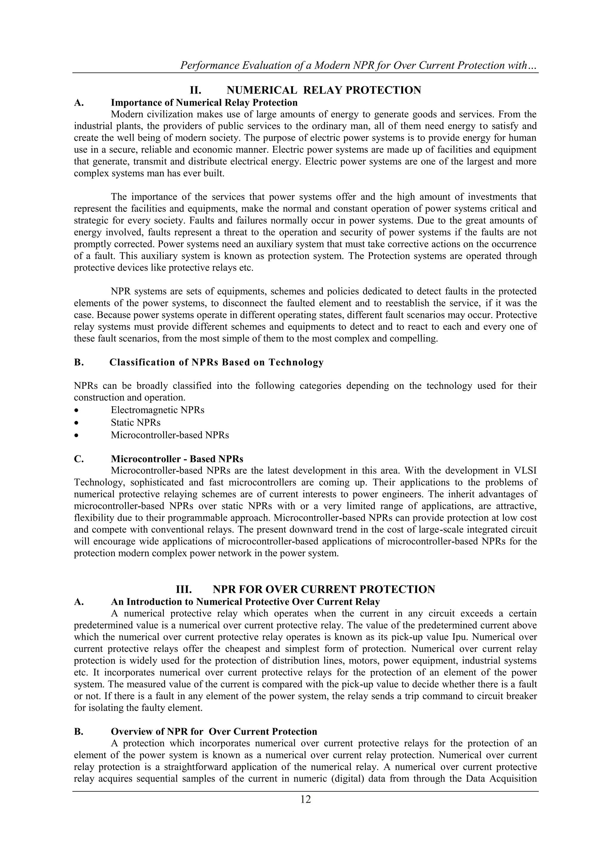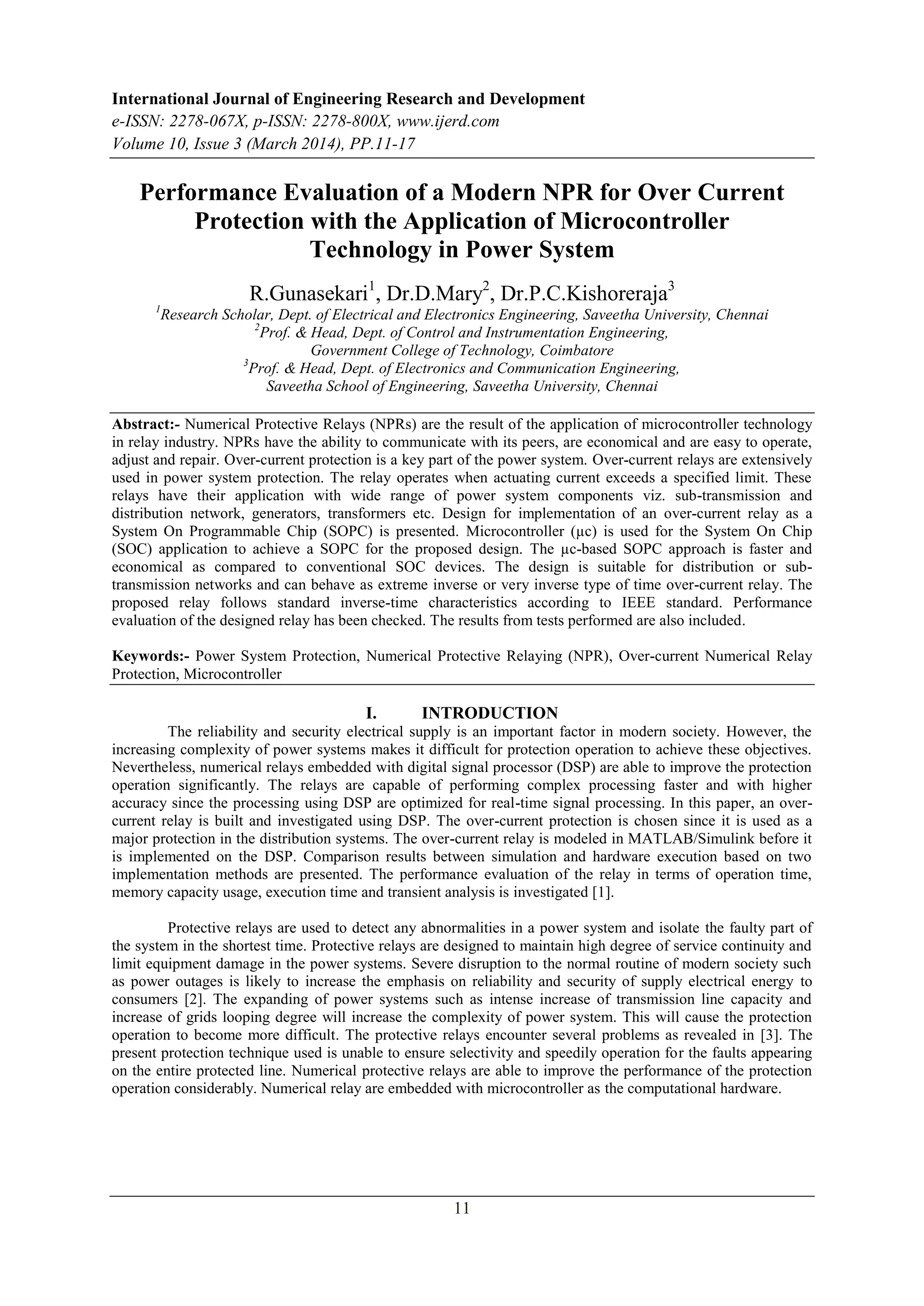 This document summarizes the performance evaluation of a modern numerical protective relay (NPR) using a microcontroller for overcurrent protection. It describes the design and implementation of an overcurrent relay using a microcontroller-based system-on-chip approach. The relay is tested according to IEEE standards and shown to operate within acceptable time limits. Test results demonstrate that the microcontroller-based design provides adequate reliability and security for overcurrent protection while improving performance compared to conventional designs.