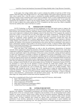 The document discusses voltage stability issues in power systems, emphasizing the importance of assessing maximum loadability to prevent voltage collapse using the Fast Voltage Stability Index (FVSI) and Thyristor Controlled Series Capacitors (TCSC). It details a methodology that applies these indices to enhance system stability and improve power flow, specifically through simulations conducted on a 14 bus power grid. The paper highlights the critical role of ongoing monitoring and the impact of reactive power management in maintaining power system stability.