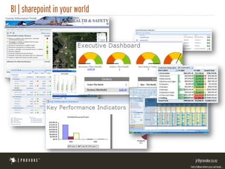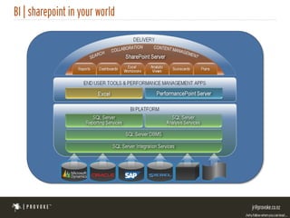 This document summarizes the key benefits of integrating business intelligence capabilities with Microsoft SharePoint. It discusses how SharePoint can help address three legacy issues with BI: noise in data, lack of fit for purpose, and lack of access and visibility. The document outlines Microsoft's BI roadmap using SharePoint and how this provides interactive dashboards and scorecards to give insights at all organizational levels. It positions SharePoint as providing a solution to common excuses around data security, time pressures, costs and complexity that have hindered BI adoption in the past.