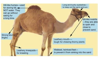 This document discusses animal adaptations for survival in different environments. It provides examples of how Arctic and desert animals have adapted through physical traits like thick fur or thin coats and body shapes that minimize heat loss or gain. Sharks are used to demonstrate both general aquatic adaptations like streamlined bodies and gills as well as specific predatory adaptations like sensitive smell and replaceable teeth. Surface area to volume ratio is discussed as an important factor in an animal's ability to retain or shed heat.