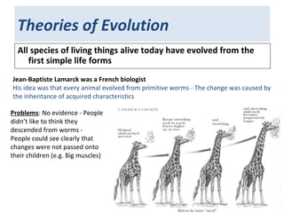 1. Theories of evolution progressed from Jean-Baptiste Lamarck's idea that acquired traits could be inherited, to Darwin's theory of natural selection and evolution of all life from simpler forms.