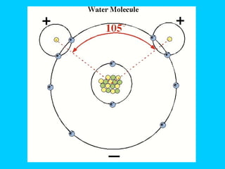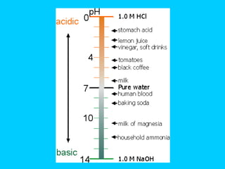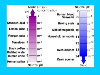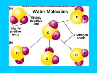 Water makes up a large percentage of living organisms and plays several important roles. It is a polar molecule that forms hydrogen bonds, giving it properties like being an excellent solvent, temperature regulator, and lubricant that are beneficial for life. Biological systems also rely on maintaining precise pH levels, which is influenced by acids, bases, and buffers. Buffers help stabilize pH by neutralizing excess hydrogen or hydroxide ions through various chemical reactions important for biological functions.