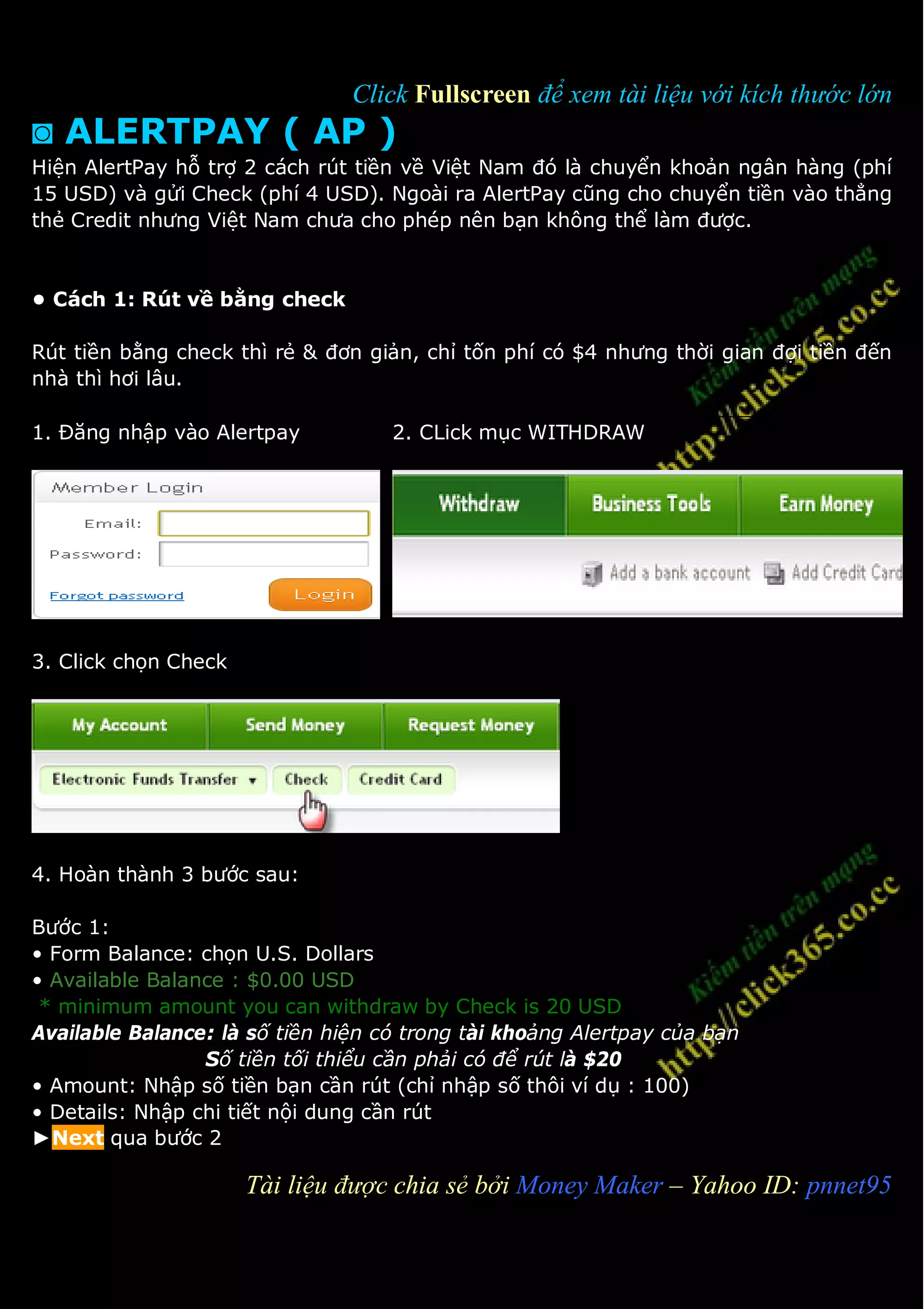 Alertpay hỗ trợ hai cách rút tiền về Việt Nam: bằng check (phí $4) và chuyển khoản ngân hàng (phí $15). Rút tiền bằng check thường mất thời gian lâu hơn (1 tháng), trong khi chuyển khoản ngân hàng nhận được trong 3-4 ngày, nhưng yêu cầu số tiền tối thiểu là $40. Cần điền thông tin đầy đủ khi thực hiện các bước rút tiền theo hướng dẫn cụ thể.