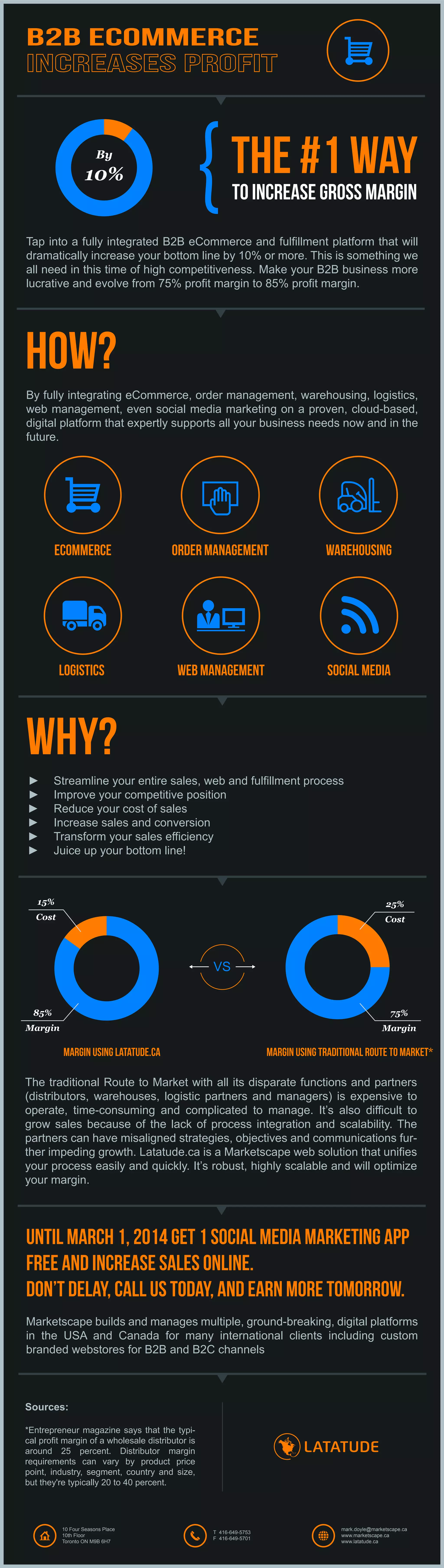 This document promotes a B2B eCommerce and fulfillment platform that can increase a company's gross margin by 10% or more by fully integrating eCommerce, order management, warehousing, logistics, and other functions. Traditionally, using multiple partners for these services costs 15% of revenue but this platform allows companies to reduce costs to 10% while increasing margins from 75% to 85% through streamlining and process integration. The platform is cloud-based, scalable, and can optimize margins while transforming sales efficiency.
