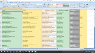 The document appears to be a compilation of contact information for various individuals and companies formatted in a CSV style. It includes names, emails, phone numbers, and company affiliations, primarily related to different sectors such as insurance and logistics. The information is presented in a spreadsheet layout typical for Microsoft Excel.