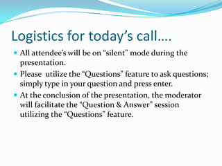 The document outlines the logistics for a webinar hosted by Sales Benchmark Index, including guidelines for participants during the presentation and information on a follow-up Q&A session. It features Dan Perry as the guest speaker and discusses lead generation, demand generation processes, and the importance of understanding buyer personas. Additionally, it promotes a future webinar on sales resource planning scheduled for October 13, 2011.