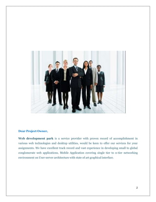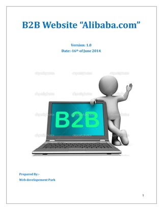 The document proposes developing a website similar to Alibaba.com. It would allow buyers and sellers to register, login, post products for sale, search for products, and make purchases in escrow. The website would be developed using a central database and server application. Key features for buyers are searching, viewing products, shopping carts, and purchases. For sellers, features include posting products and company details, managing inventory, and viewing buyer requests. An admin can manage user accounts, categories, products, orders, and payments.