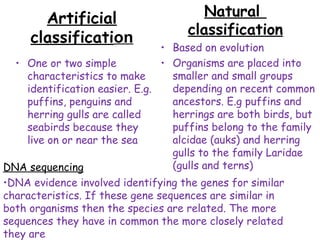 There are five kingdoms that classify organisms based on their cellular structure: Animals, Plants, Fungi, Prokaryotes, and Protoctists. All organisms can also be classified in a hierarchical manner from the broadest category of kingdom down to the specific species level. The binomial system of scientific naming developed by Carl Linnaeus assigns every species a two-part scientific name. Modern classification is based on evolutionary relationships determined by comparing DNA sequences and other genetic evidence.