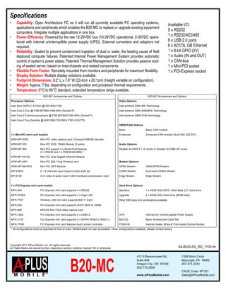 The B20-MC is a sealed server designed for military applications. It uses Intel processors and chipsets in a compact, sealed aluminum case with patented cooling technology. The server is powered by 10-36VDC, has configurable I/O connectors, and is designed to run all PC operating systems and software.