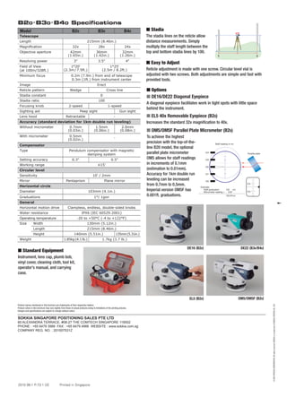 The document details the Sokkia B series automatic levels, emphasizing their reliability, ease of setup, and precision features for surveying tasks. It highlights the advanced compensator and technological superiority that ensure performance under various environmental conditions. Specifications of different models, including telescope magnification, accuracy, and optional accessories, are provided.