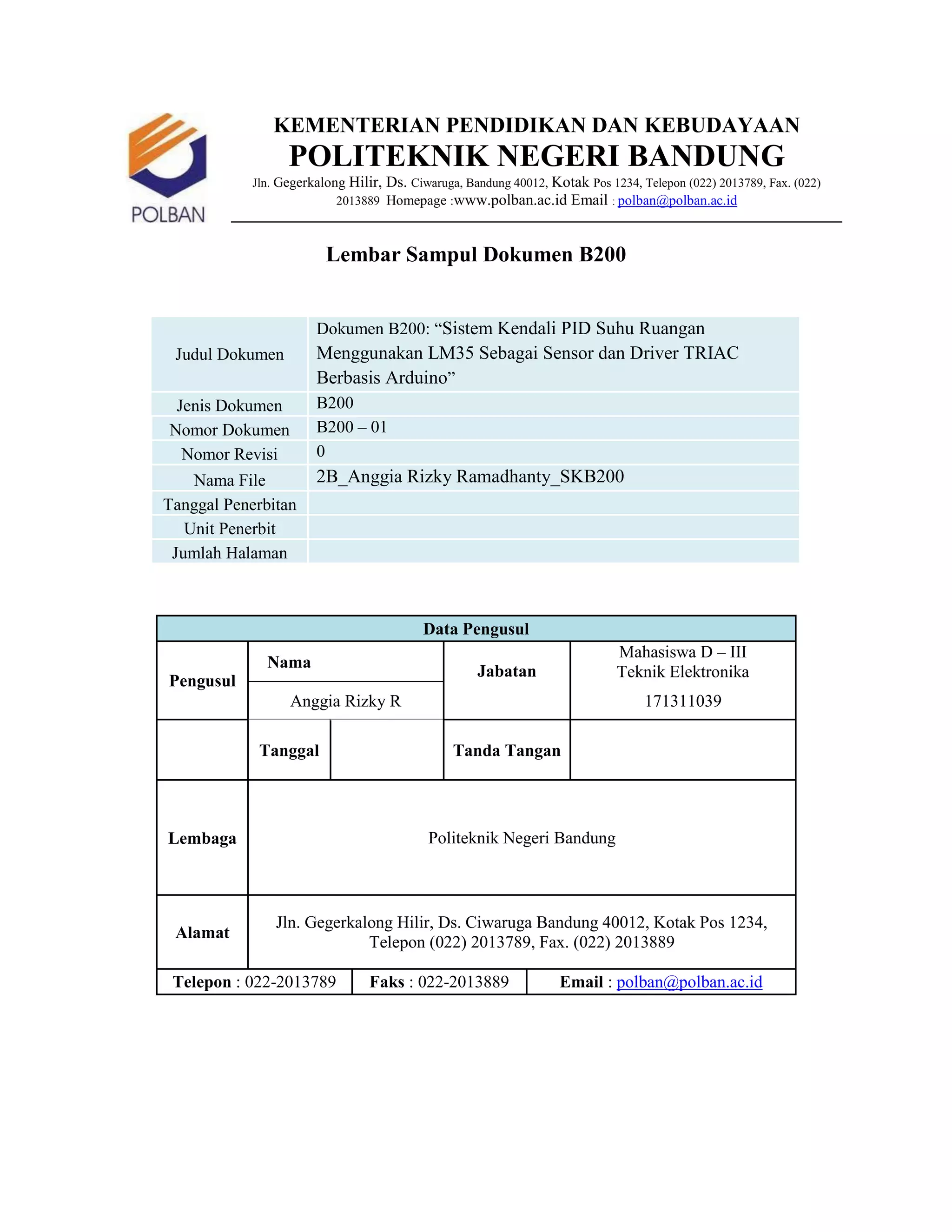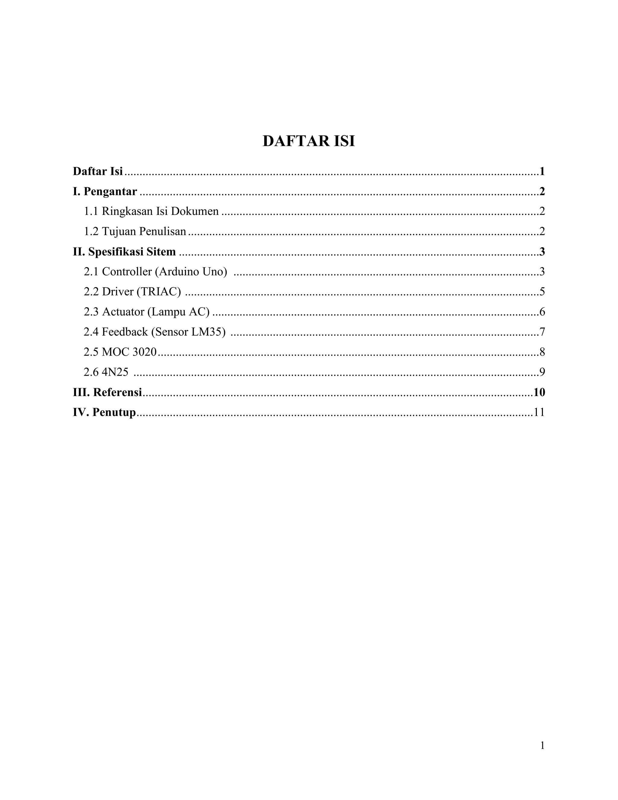 Dokumen ini berisi ringkasan spesifikasi sistem alat Sistem Kendali PID Suhu Ruangan Menggunakan LM35 Sebagai Sensor dan Driver TRIAC Berbasis Arduino. Spesifikasi tersebut meliputi controller Arduino Uno, driver TRIAC, actuator lampu AC, sensor suhu LM35, optocoupler MOC3020, dan isolator 4N25. Dokumen ini bertujuan sebagai dokumentasi dan acuan pengembangan proyek.