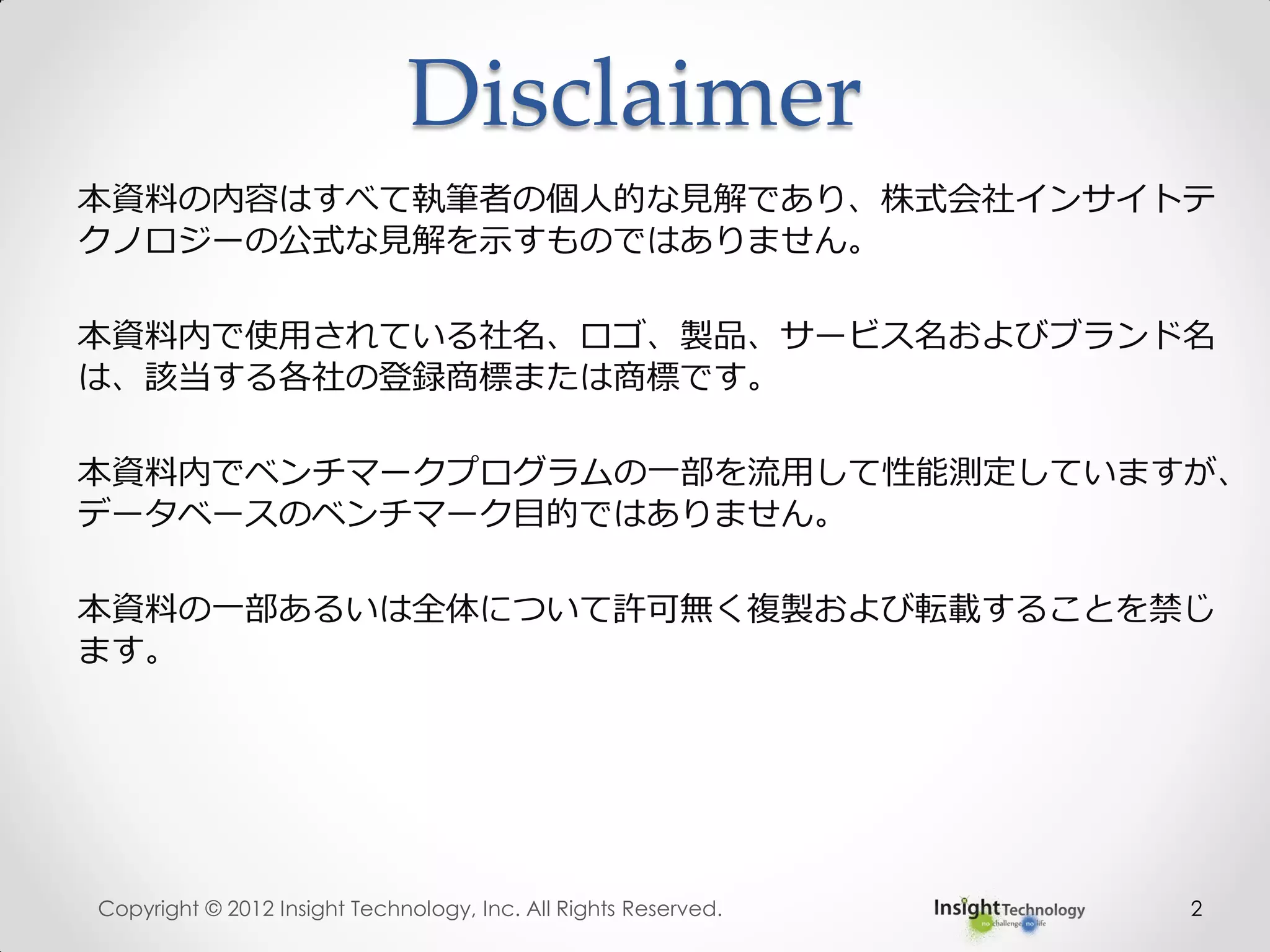 CPUの数が多いほうがメモリ帯域を有効に使用出来る (Core数では無い) o 大容量メモリを使用するならR-DIMMではなく LR-DIMMを使用 する必要がある。速度も LR-DIMMが有利。 o Memory Channelを有効に使える枚数を意識する • 使いどころの把握 o OLTP的な処理では効果が見込める o DWH的な処理の場合、充分に早いスループットを実現している ストレージの場合、メモリの効果が出ないパターンがある • コスト o 特に大容量メモリを実現する場合、コストは高い。IQなら安い! Copyright © 2012 Insight Technology, Inc. All Rights Reserved. 59