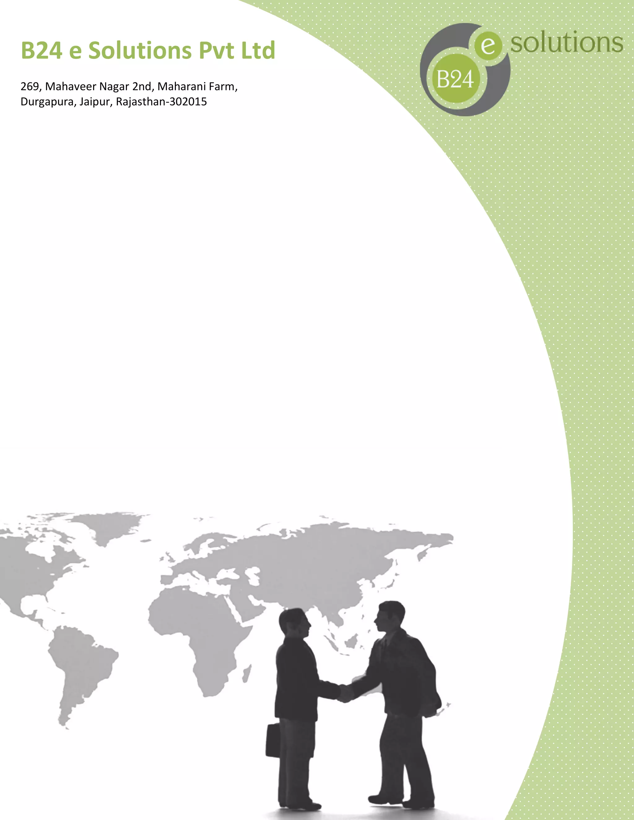 B24 e Solutions is an IT company based in Jaipur, India that provides software development, consulting, and offshore outsourcing solutions. They have over 500 completed web application projects and 300 mobile application projects. Their core principles are maximizing cost savings for clients through increased productivity and quality. They invite other companies to partner with them for business or technology partnerships.