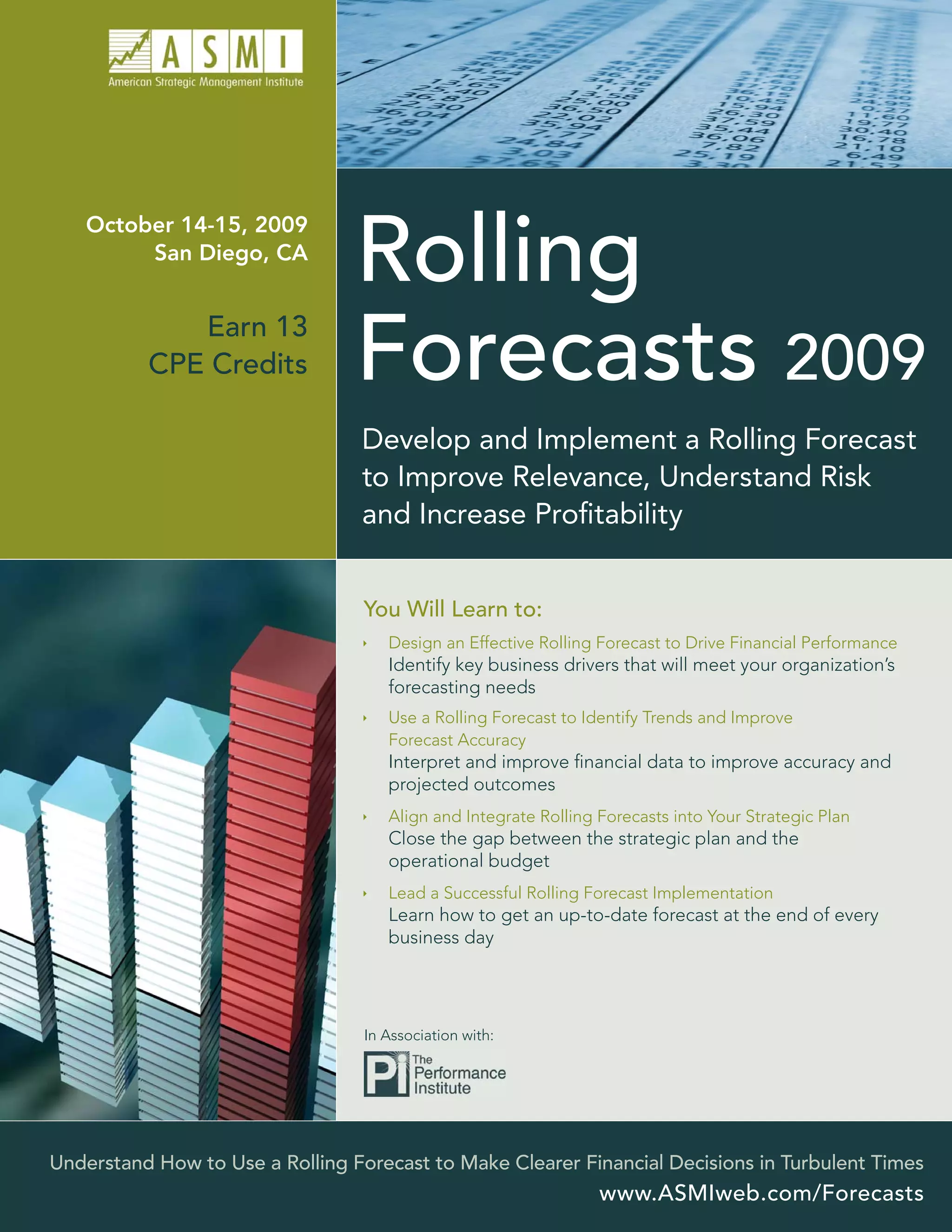 This two-day conference on developing and implementing rolling forecasts will be held October 14-15, 2009 in San Diego, CA. Attendees can earn 13 CPE credits. The conference will teach how to design effective rolling forecasts to improve financial performance and profitability. Attendees will learn how to identify key business drivers, improve forecast accuracy, integrate rolling forecasts into strategic plans, and successfully implement rolling forecasts. Speakers will discuss replacing traditional budgets with more frequent targets and standardizing bottom-up forecast processes.