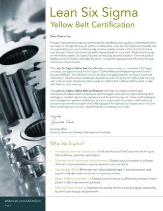 The document provides information about a Lean Six Sigma Yellow Belt Certification conference to be held on July 13-15, 2009 in Washington DC. The conference will teach participants about Lean Six Sigma concepts and tools to improve organizational processes using the DMAIC methodology. It will include presentations, exercises and a certification exam. An optional post-conference workshop on July 15th will provide guidance on deploying Lean Six Sigma in an organization.